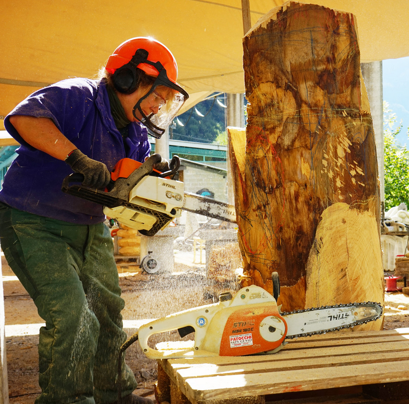 Schon am ersten Tag geht es richtig los mit dem Aussuchen der Holzstämme: Zedernholz aus dem Tessin, leicht, feinfaserig und wetterbeständig und deshalb besonders geeignet für die Kunst der Bildhauerei. Sie stehen vor einem Holzstamm und versuchen sich die Figur darin vorzustellen. Freude, Mut und Courage stehen im Raum und der Wille bald anfangen zu können ist kaum noch zu bändigen - sogleich erfüllt der Zedernduft die Atmosphäre.